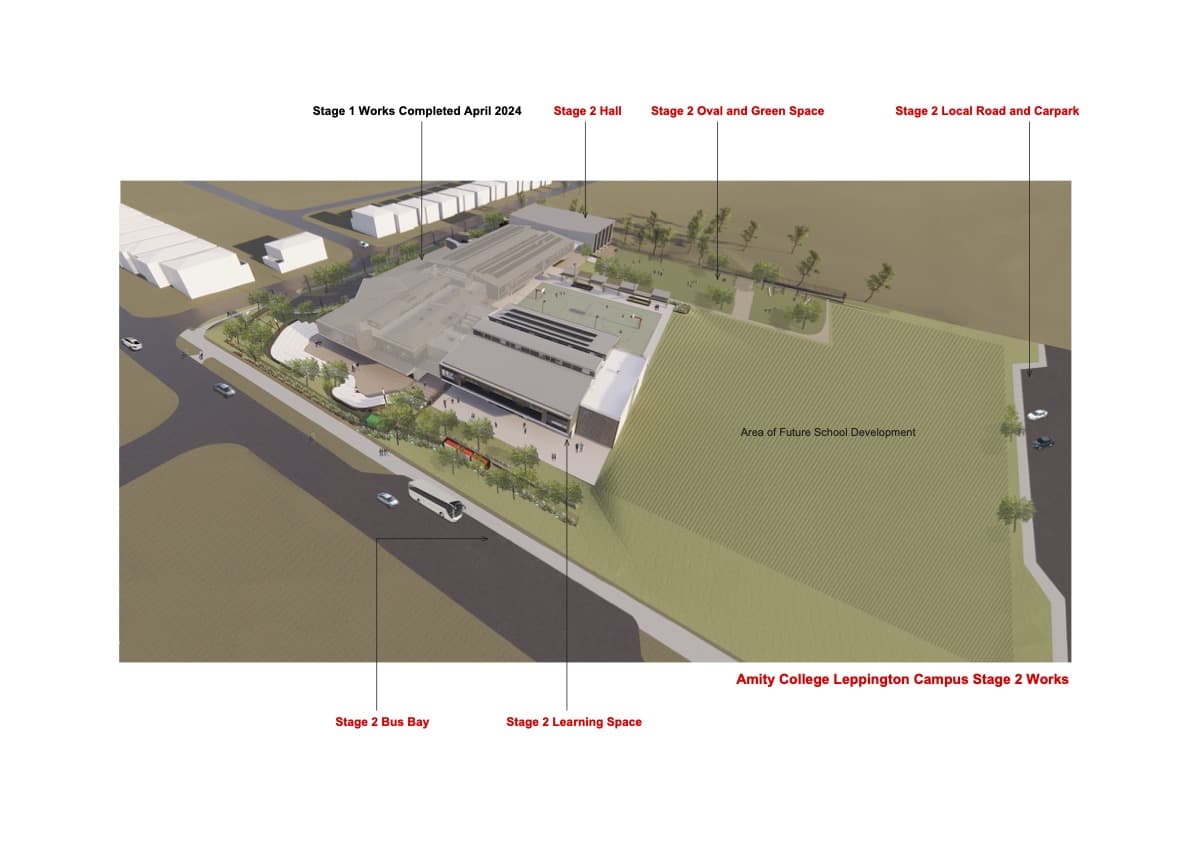 Stage 2 will provide additional capacity for 250 more students. It includes the construction of a primary school hall, 11 classrooms, a science laboratory, a bus bay, new footpaths, roadworks, and associated infrastructure. Additional features include a school oval, passive play areas, a community garden, and a playground available for use by the broader school community.
