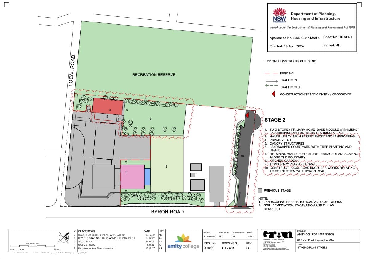 - DA modification consent was approved on 19 April 2024 for minor internal and external amendments to buildings and landscaping, plus bringing forward the primary hall from Stage 4, local road development from Stage 5 and bus bay development from Stage 3 into Stage 2 project.
